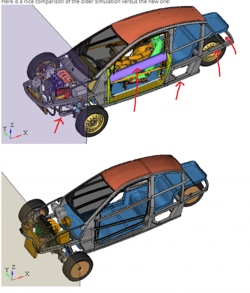 Computer Aided Engineering (CAE) simulation is used to virtually study each of the modes Elio is targeting for “crashworthiness.” These simulations provide digital predictions of the physical testing performance before real hardware is available. The simulations address the vehicle’s structure, powertrain, suspension and occupants.