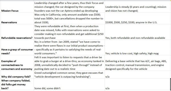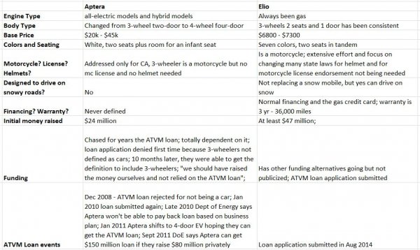 I frequent the Facebook posts from Elio Motors, and I tired quickly of folks saying things like "bah ... the Elio... just like the Aptera...". I decided to do a little compare and contrast, to show if they are similar in any respects.