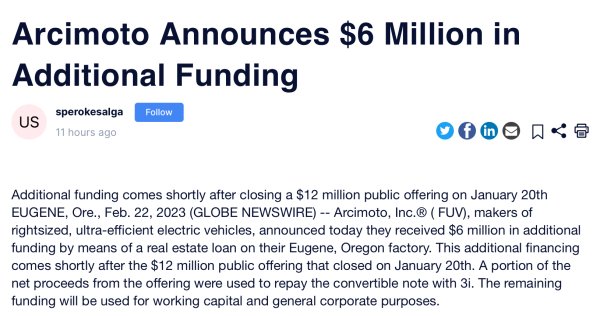 There you go. We'll see but Arcimoto is now down to taking loans with a company that deals with distressed companies. Fome looking at their previous deals, it doesn't look good. On the other hand, maybe they will come in and cut the cost of making a FUV to $9K and start selling that $11,900 version. The way I see it, they have not crossed the finishline. Just passed more milestones than some other startup three wheelers have.