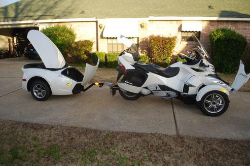 a Spyder passed me on the Interstate yesterday as we were just north of Atlanta on I-75 north. Pulling a tiny pop up camper, had 2 people on the spyder. The hitch was directly on the spyder similar to some motorcycle hitches. Tried to catch it and get my wifey to take a pic. They were going too fast and traffic was too thick. Spyder seemed to have no problems, and no wiggle in the trailer. Strapped on top of the popup camper was a cooler. The camper had Florida tags.