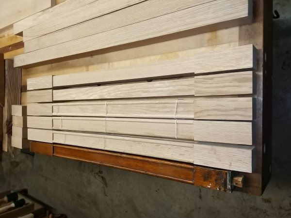 Here is a different set of spindle for the same niece. These are straight, but the center is reduced and has 3/4 round "dowels" on the four edges. The dowels required a jig to hold them and a rabbit plane was used to remove the waste. (Note: This was done entirely with hand powered tools - no electrical.)