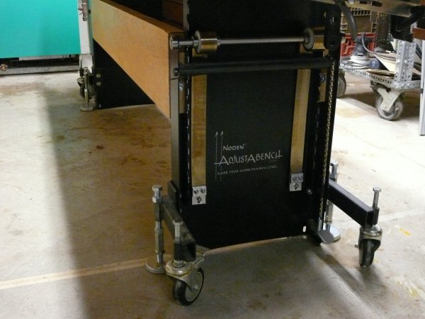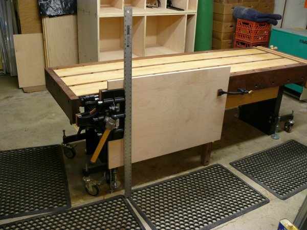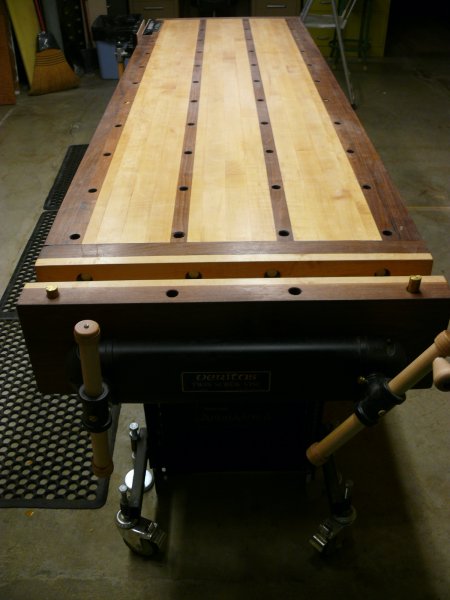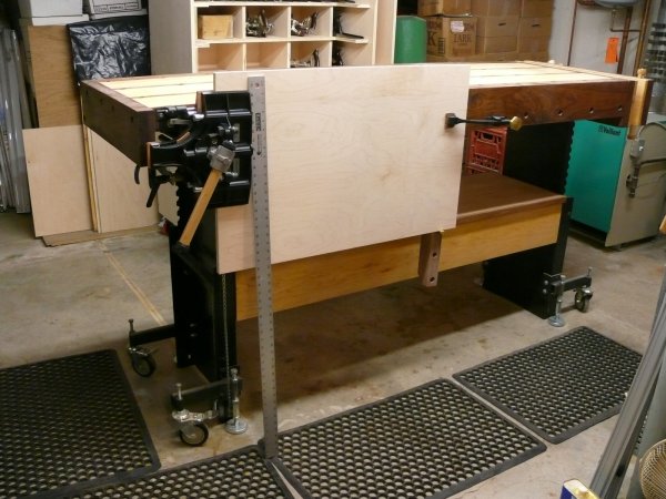 Here are some picture of my workbench just after it was constructed in 2009. It is made from walnut and maple with adjustable height legs. There are two vices, a Tucker patternmakers on a corner and a twin screw on the end. To help lift the top up there were constant force springs that give 50 lbs lift on the twin screw end, and 75 lbs on the Tucker end. The bench can be adjusted from 29" to 45" or even tilted. The Tucker vice rotates 360 degrees and tilts 90 degrees. My tool cabinet was just starting to be constructed.