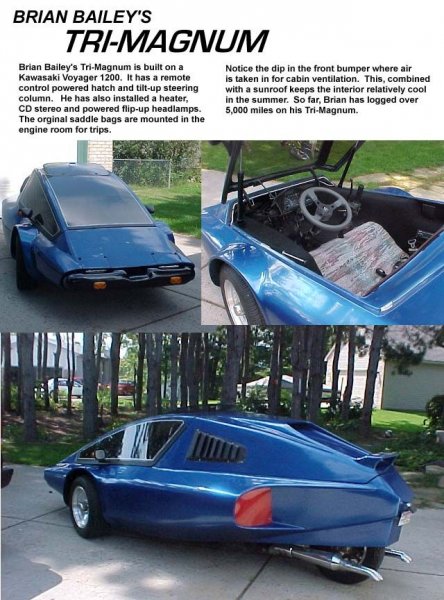 I still have the Mechanics Illustrated magazine article about how to build one of those. I love this thread! It is amazing to me to see so many different 3 wheelers and how long ago they have been around. Keep em coming! And yes you can delete this if you want to, I just had to comment.We may as well hit the DIY arena in the 70's and 80's with the Tri-Magnum. One of the few kits that people actually built.