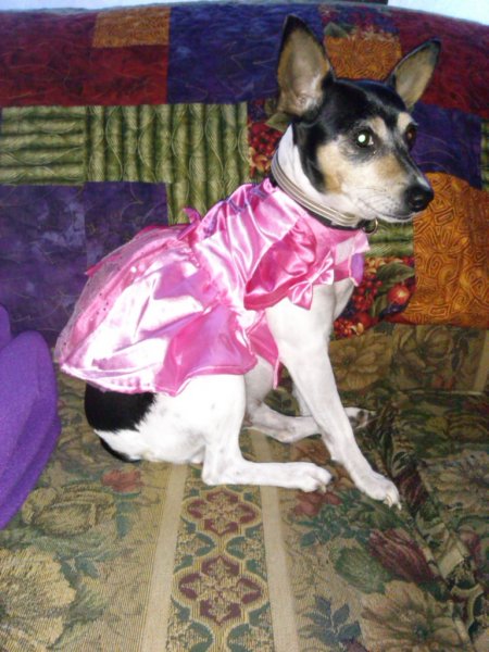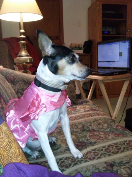 Had to figure how to get pictures off phone to computer then to here. This is Heidi in her pink princess dress. She really is a farm dog but likes to wear clothes and sweaters. We can delete if we don't like the pictures you make, but I doubt that will happen.