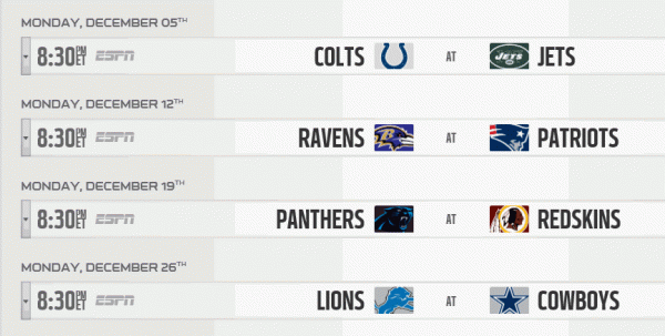 Ok, makes some sense; and I'm not about to put TNF schedule up, that's got some "let's see what else is on" after the first quarter matchups.What I meant was that none of those Monday night games are good rivalries... No good matchups.