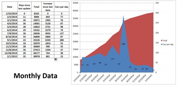I bet reservations will go up after they fire the engine up on Friday and then Paul Elio does his gig on Saturday. Of course all hell will break loose with funding for production as people try to get in line and end up with over 60,000 reservations and then people are miffed because they realize they'll be waiting two more years. Even a win can become a no win getting a business of the ground, though I eagerly wait for those types of problems.Number of current reservations: 38,978 as of Feb 1, 2015 = 214 added = 30.6/day, up from 24.4 last week.