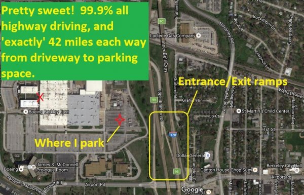 I'm 1/4 mile from I-44, and Boeing has it's own exit off the highway [I-170] up near the airport that dumps right into my parking lot, with an entrance ramp from the parking lot directly onto the highway for the way home. The 1/4 mile of "city driving" will hopefully be enough to allow the Elio to warm up before I put the pedal down. 84mpg "should be" my average.