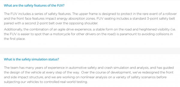 84, No reason to wear a helmet. It would be the same as wearing a helmet in the Elio. However, I am required a motorcycle endorsement in Idaho and helmet laws are <18 years of age required. My wife and I plan on taking the written test in a week or so, and scheduling the riding test after taking delivery of our FUV. The FUV seating is equipped with a standard 3-point safety belt paired with a second 2-point belt over the opposing shoulder. I felt securely anchored against the seat back during my test drive. Very comfortable seat and upright sitting position, much like my SUV. I’ve never owned a motorcycle due to safety concerns and frankly don’t feel particiulary safe driving either the FUV OR the Elio in the event of a side impact collision, but just safe enough to purchase one. :) I plan to drive ‘motorcycle safe’ defensively and ready to act with zero distraction to avoid potential accident scenarios. The FUV sits as high as my SUV so its easier to see and be seen. Also, ordering the Yellow color, not my favorite, but highly visible for an extra margin of safety. FAQS regarding the FUV safety features below: