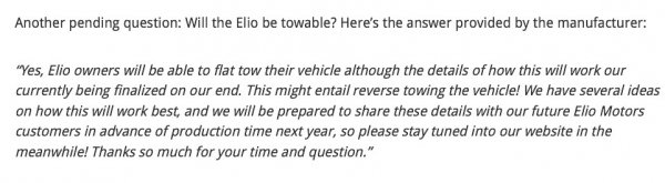 Hmmmm, Nuff said..Much of the speculative discussion in many of the forums could be rendered moot. LOL I did find this statement from Elio regarding towing: